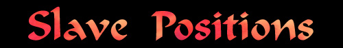 | Bara A slave lays on her belly, her forehead pressed to the floor. She crosses her ankles and places her wrists, also crossed, in the small of her back. She waits motionless to be bound. Belly A slave lays on her belly, parts her legs, shoulder-width apart and lays her arms by her sides, palms up, her forehead to the ground. She then crawls to her Master's feet, remaining on her belly as she does so. Bracelets A slave kneels, thighs spread wide, back arched, and extends her arms before her, her wrists together in preparation for being bound. Her head is held high, her eyes lowered submissively. (A Master may require the wrists behind the back. An alternate is the standing position, where the slave spreads her legs shoulder width apart). Crawl A slave drops to all fours, her forearms flat on the ground, and lowers her head so that it is slightly above, but not touching, the ground, raising her ass high. She crawls to her Master until her head is by his boots. Gorean Bow A slave kneels, thighs spread wide, and leans over backwards until her head touches the floor. She then pulls herself up, arching her back. This exposes a slave's heat and breasts for her Master's enjoyment. Hair A slave remains in whatever position she is in but gathers her hair and offers it to her Master. Heel A slave kneels just behind her Master's left foot. As He moves she must remain just behind His foot, but must never come in contact with it at any time. Karta The slave kneels on the floor, her thighs spread wide, and leans forward placing her breasts and forehead against the floor, her arms fully extended, palms against floor. Ankles may be crossed or uncrossed. A slight variation on this is the "suga", which involves the slave crossing her wrists instead of placing her palms on the ground. Ko-lar The ko-lar, or collaring position, is also called "The Position of Female Submission." A slave kneels at her Master's feet, sitting on her heels. She extends her arms upward, and crosses her wrists. Leading Position A slave approaches her Master's side and bends at the waist, gathering up her hair to present to her Master, so he may lead her by the hair. Leasha A slave kneels with her back to her Master, her thighs spread wide, her back arched. She crosses her wrists in the small of her back for bracelets if required. She then turns her head to the left, her eyes lowered in submission, her lips slightly parted and awaits His leash. Leasha, High A slave stands, her back to her Master, with her feet shoulder-width apart, her wrists crossed at the small of her back. She holds her head high, turning it to her left, her lips slightly parted and lowers her eyes in submission. She awaits His leash. Nadu A slave kneels with her thighs spread wide, her back arched, her head held high and her eyes lowered submissively. She lays her hands palms up on her thighs. Obediance A slave lays on her belly and places her chin on her Master's feet. Run A slave runs toward her objective, taking small rapid steps, her legs almost straight, her feet barely leaving the floor. As she runs, her back is straight, her head is turned to the left, her arms are at her sides with palms facing outward. Upon reaching her objective she drops gracefully to her knees and typically resumes the position of Nadu. She-sleen A slaves gets down on her knees and elbows and clasps her hands over her head, raising her hips as she does so. She parts her thighs and arches her back, forcing her hips yet higher, exposing herself completely to His view or caress. She readies herself to be beaten or taken sexually like an animal, depending on her Master's whim. Slaver's Kiss A slave drops to her hands and knees, her forehead to the ground, her hips raised high. She spreads her thighs wide, exposing her slave heat for her Master's pleasure. Slave Lips A slave turns her head up to her Master, puckering her lips as she does so. She waits motionless, forbidden to move until her Master's kiss releases her. Submission A slave kneels, bending at the waist, placing her cheek to the floor. She then takes the Master's right foot and places it upon her neck, her arms behind her back with her wrists crossed. A girl might assume this position if she has displeased her Master, as it shows complete submission, His foot on her neck showing that she offers Him even her life freely. Sula A slave lays flat on the floor on her back, her feet spread shoulder width apart. She places her wrists above her head and crosses them. Her eyes remain lowered in submission and she silently awaits her Master's pleasure. Sula-ki The sula-ki is also known as the alternate sula. A slave lays flat on the floor, face upward, her hands at her sides, palms open and up. Her legs are spread wide in preparation for her Master's pleasure and she slowly lifts her hips off the floor. Table A slave has many uses to her Master, one of which is to present herself as a table, to support his feet or drink. She goes to all fours making sure her back is level, her head held straight, her eyes lowered in submission. The girl should ensure she is stable, so as not to risk spilling the drink, or disturbing her Master, and should remain totally motionless. Stability can be increased if a girl ensures her thighs are parted widely and her elbows locked. Tower A slave kneels with her knees modestly together, back straight, eyes lowered. Her palms rest down upon her thighs. Walk When this command is given, a slave turns gracefully, her hair caressing her body as she turns. She walks quietly across the room or camp, her feet hardly seeming to leave the ground, her hips swaying sensually, her body erect and proud. When she reaches her objective she halts and stands, her body erect, her shoulders back, her chest thrust forward, her belly in. She turns her hips out a bit, her hands at her sides, and points one foot. Her chin is held high and her eyes are lowered. Whipping Position A slave quickly drops to her knees and raises her hip