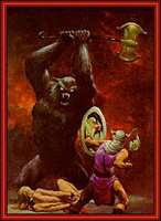 | Armoured Gatch: A marsupial mammal which inhabits the rainforests inland of Schendi. Bint: Small carnivorous freshwater fish which inhabits the rivers of the rainforests inland of Schendi; a large school of bints can strip a carcass in minutes; similar to the piranha of Earth. Bosk: Large, shaggy, long-horned bovine similar to the Earth cow; cattle. Dock Eel: A black freshwater fish, 4' long and weighing 8-10 lbs.; carnivorous, they inhabit the shallow waters around the dock and wharves of river ports. Fleer, Prairie: Yellow bird with long wings and a sharp bill; sometimes called the “maize bird” or “corn bird” from the belief that it is usually the first bird to find food; a large, hook-billed bird which hunts at night. Fruit Tindel: A bird which inhabits the rainforests of the Schendi area. Gant: 1) Jungle: A bird, related to the marsh gant, which inhabits the rainforests inland of Schendi; 2) Marsh: A long-legged marsh bird with a piping cry; similar to an Earth curlew. Giani: A large mammal of solitary habits which inhabits the rainforests inland of Schendi. Gim: 1) Horned: A small owl-like bird, about 4 ozs. in weight, which inhabits the forests of northern Gor; 2) Long: An insectivorous bird which inhabits the rainforests inland of Schendi; 3) Yellow: A colored variety of the bird, related to the horned gim, which inhabits the rainforests inland of Schendi. Gint: A tiny freshwater fish, about six inches in size, which inhabits the rivers of the rainforests inland of Schendi; it has bulbous eyes and flipper-like fins; is amphibious, having both lungs and gills; is capable of walking on its pectoral fins; is often found in the company of tharlarion, feeding off the scraps of their kills. Gint, Giant: A large cousin of the gint found in western Gor, similar in appearance, but with a 4-spined dorsal fin; is also amphibious and capable of walking on its pectoral fins. Golden Beetle: An insect, roughly the size of a rhinoceros, which lives in the caverns below the Nest of the Priest-Kings in the Sardar Mountains; its prey is the Priest-Kings Themselves. Gort, Hook-billed: A carnivorous hunting bird of the rainforests inland of Schendi; preys on ground urts. Grub Borer: An insectivorous bird which inhabits the rainforests inland of Schendi. Grunt: 1) A large, carnivorous, salt-water fish which inhabits Thassa; is often attracted by the blood of a wounded creature; similar to the shark of Earth; 2) Blue variety: a small, voracious, carnivorous freshwater fish, related to the Thassa grunt; like its larger cousin, it is attracted by blood. Gur: Thin, white honey-like liquid secreted in the Nest by a large, grey domesticated arthropod which feeds on sim plants; when fermented in the social stomachs of somnolent Priest-Kings, is ritually fed to the Mother of the Nest on the Feast of Tola. Herlit: Gorean eagle, has wingspan of 6-8 feet; is carnivorous, and has yellow feathers tipped with black; also called 'Sun-Striker' or 'out-of-the-sun-it-strikes', from its habit of striking with the sun above and behind it; inhabits the Barrens. Hinti: Small, flea-like insects; unlike fleas, they are not parasites. Hith: Huge python-like snake. Hurt: A kangaroo-like animal whose wool is used for cloth. Jard: A small, yellow-winged scavenger bird of the rainforest inland of Schendi. Jit Monkey: A simian mammal which inhabits the rainforests inland of Schendi. Kaiila: A large (20-22 hands), carnivorous mammal with long neck and silky fur; its eyes have 3 lids; is vivaparous, has incredible stamina, and can be domesticated for riding in spite of its vicious temper, though never truly tamed; in the Tahari, its long hair is used for rope. Kailiauk: Stocky ruminant, tawny with red and brown markings on haunches, having 3 horns; stands c. 20-25 hands at the shoulder